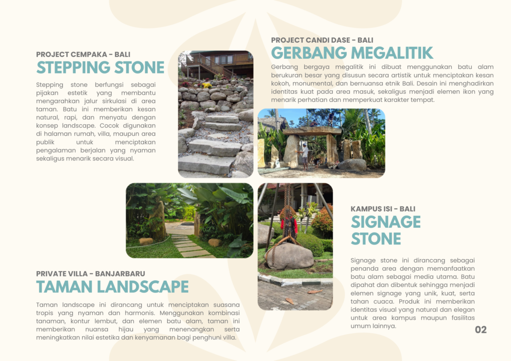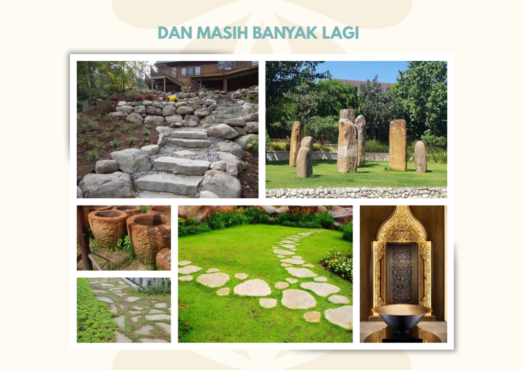 Dengan berbagai pengalaman dalam dunia landscape dan batu alam, kami telah membantu ratusan pelanggan mewujudkan taman impian, kolam alami, dan instalasi batu yang estetik dan berkualitas tinggi.