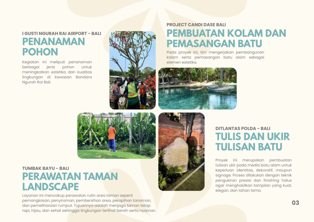 Kami membantu Anda mewujudkan taman natural, pemasangan batu alam, kolam, dan elemen outdoor dengan desain modern dan pengerjaan berkualitas.